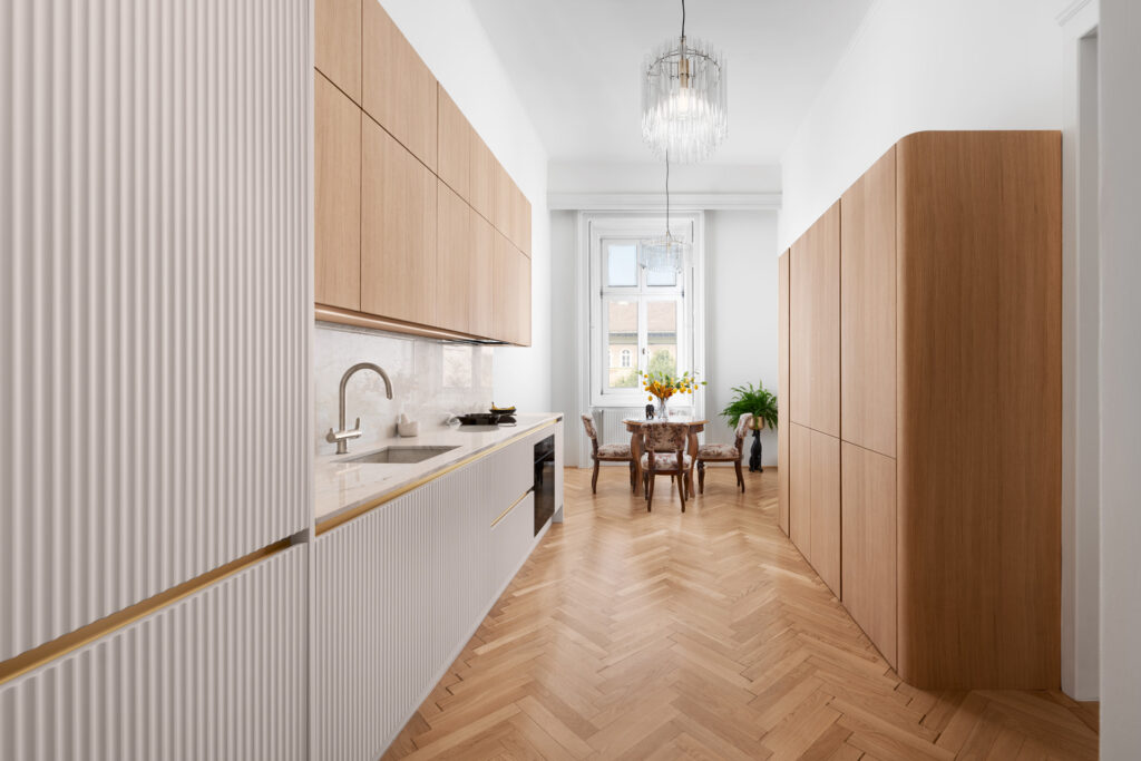 Kivitelezett projektekKülönleges klasszikus és modern összhangban megalkotott budapesti lakásÉtkező, Fürdőszoba, Klasszikus, Konyhabútor, Modern