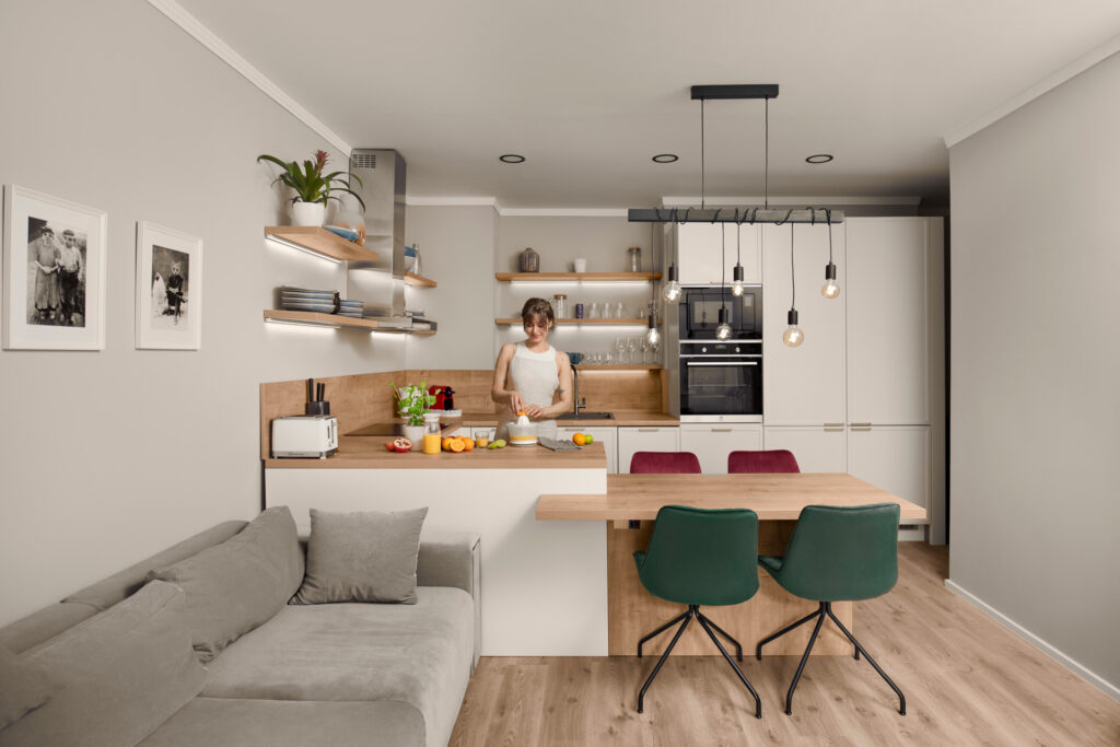 Kivitelezett projektekLetisztult, könnyed elegancia | világos bútor fa kiegészítőkkelÉtkező, Konyhabútor, Modern