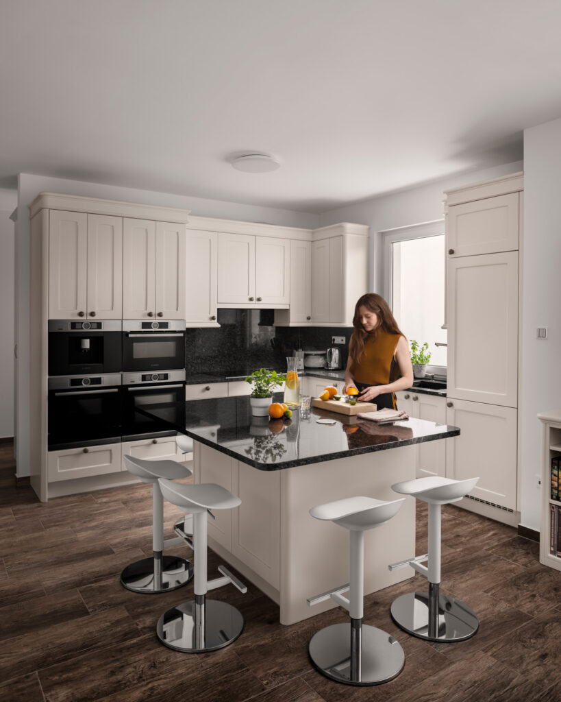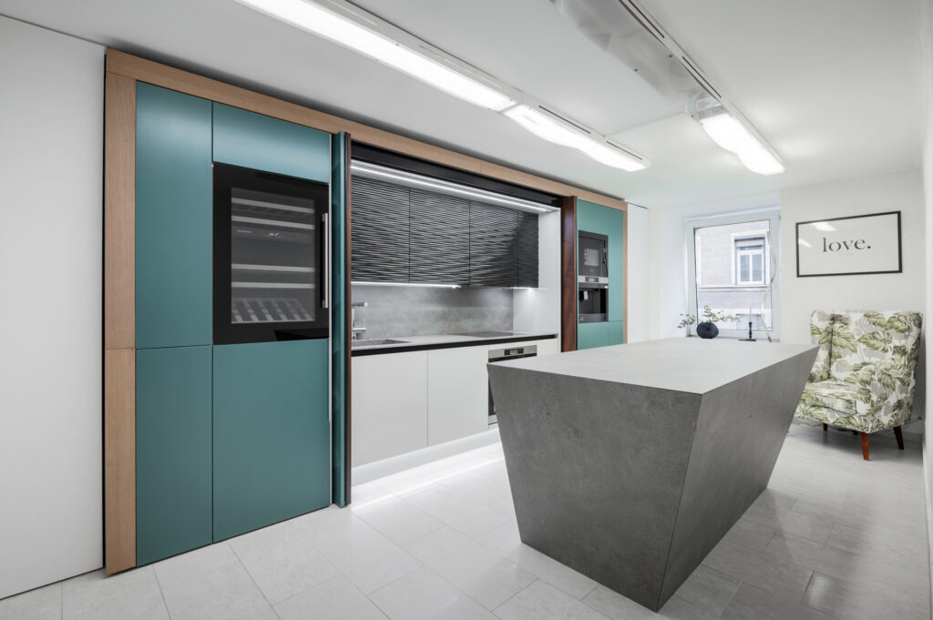 Kivitelezett projektekEgyedi marással zöld konyhabútor, betolható ajtóvalBemutatóterem, Konyhabútor, Modern