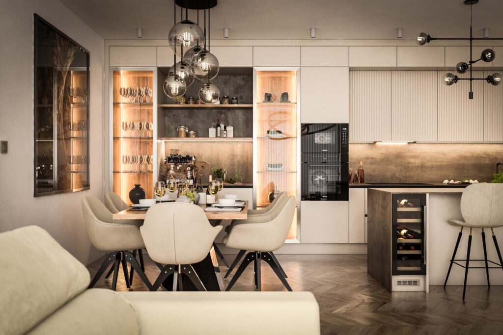 Tervezési projektekModern álomotthon különleges világítái megoldásokkalÉtkező, Konyhabútor, Látványtervek, Modern, Nappali, Tálaló