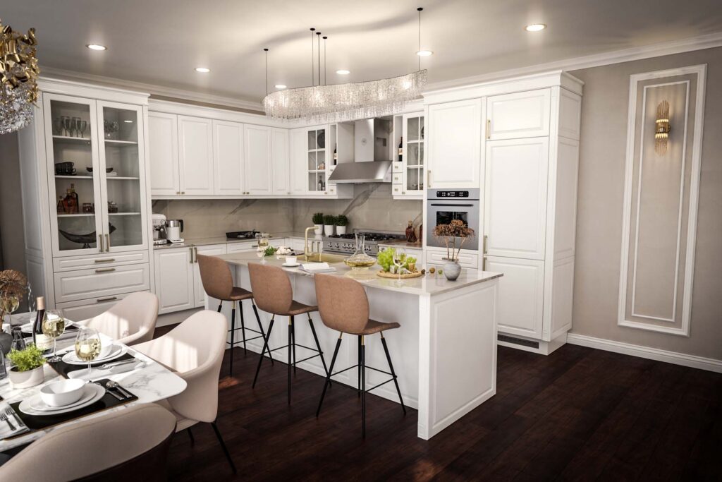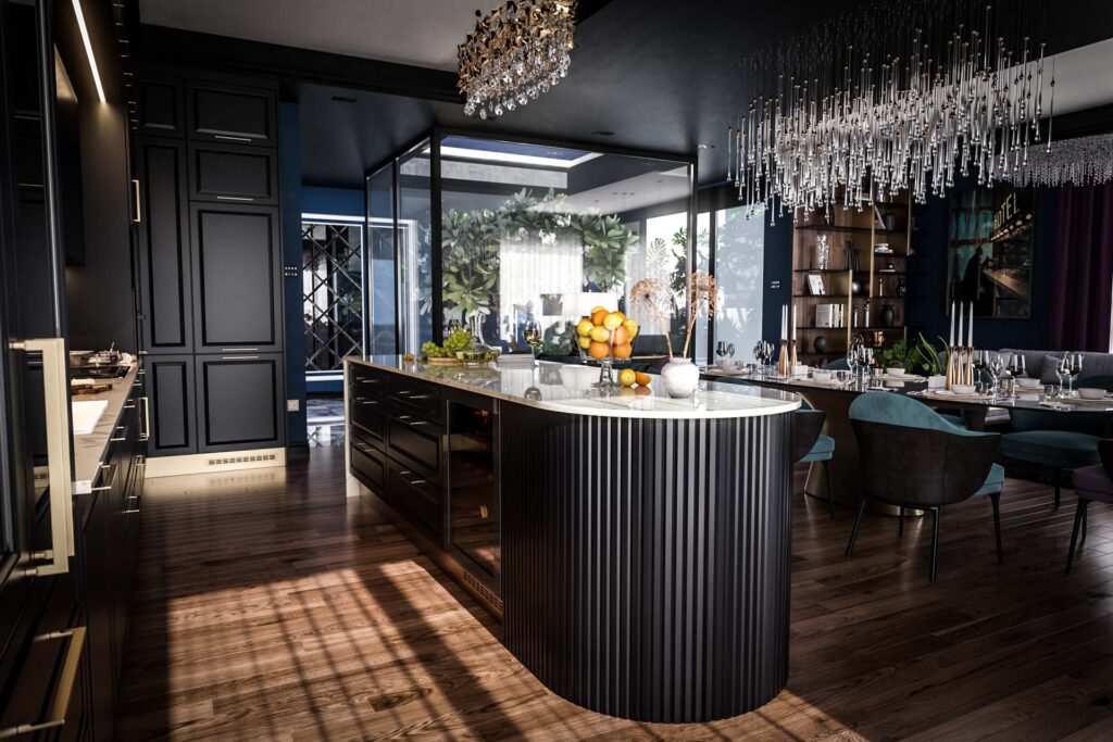 Tervezési projektekFekete luxusélettér, kristálycsillárral és ívelt bútormegoldásokkalKlasszikus, Konyhabútor, Látványtervek, Luxus, Modern, Nappali