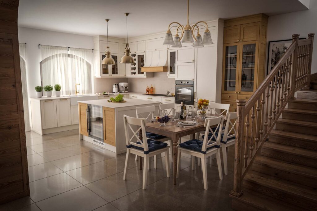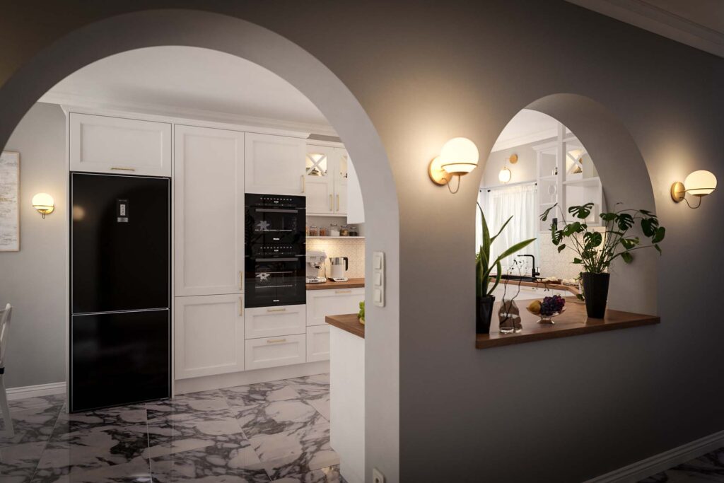 Tervezési projektekVintage bútorok ívelt átjárókkal díszített térbenÉtkező, Konyhabútor, Látványtervek, Vintage