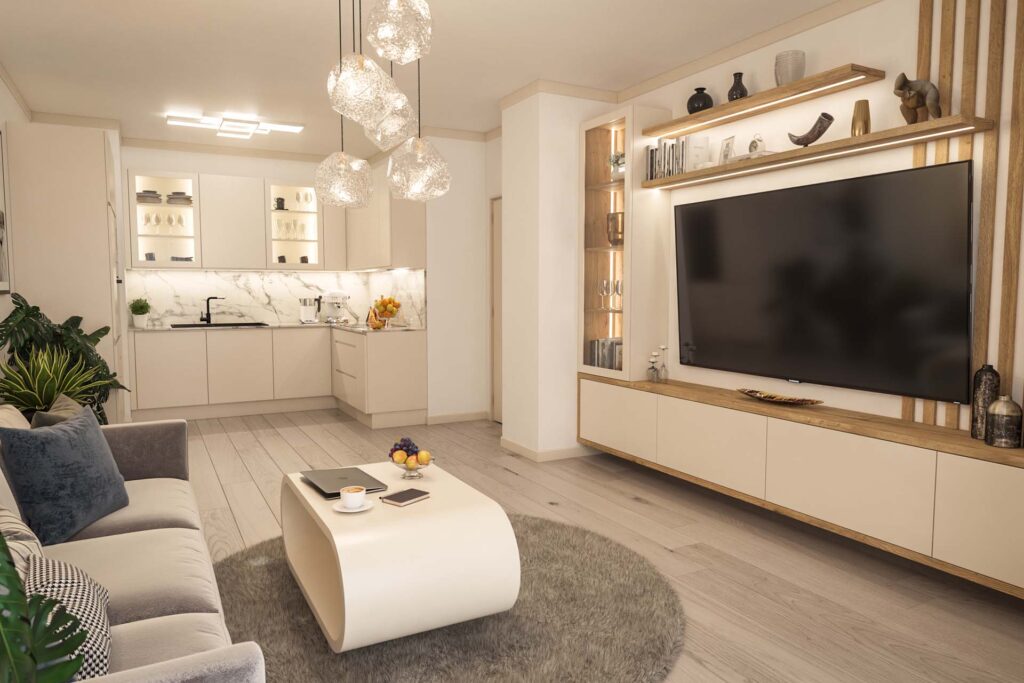 Tervezési projektekModern elegáns budapesti lakás berendezveKonyhabútor, Látványtervek, Modern, Nappali