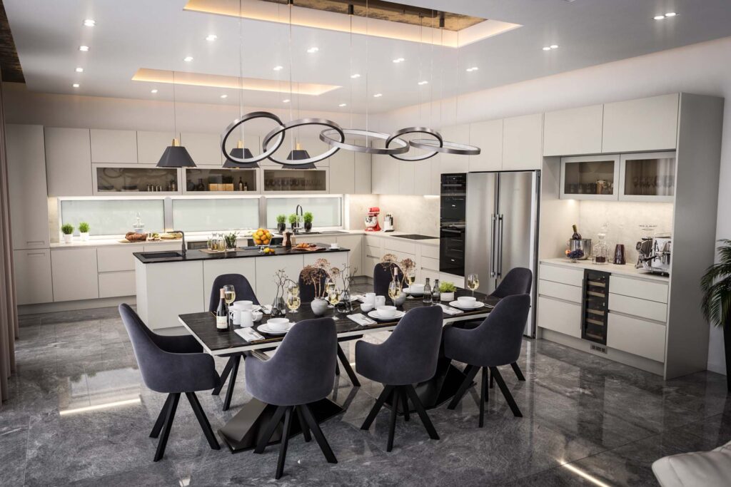 Tervezési projektekModern konyha és étkező, világos bútor, sötét kő felületekÉtkező, Konyhabútor, Látványtervek, Modern